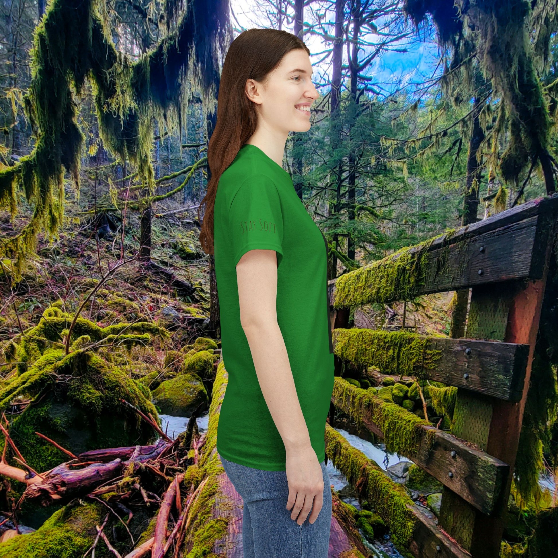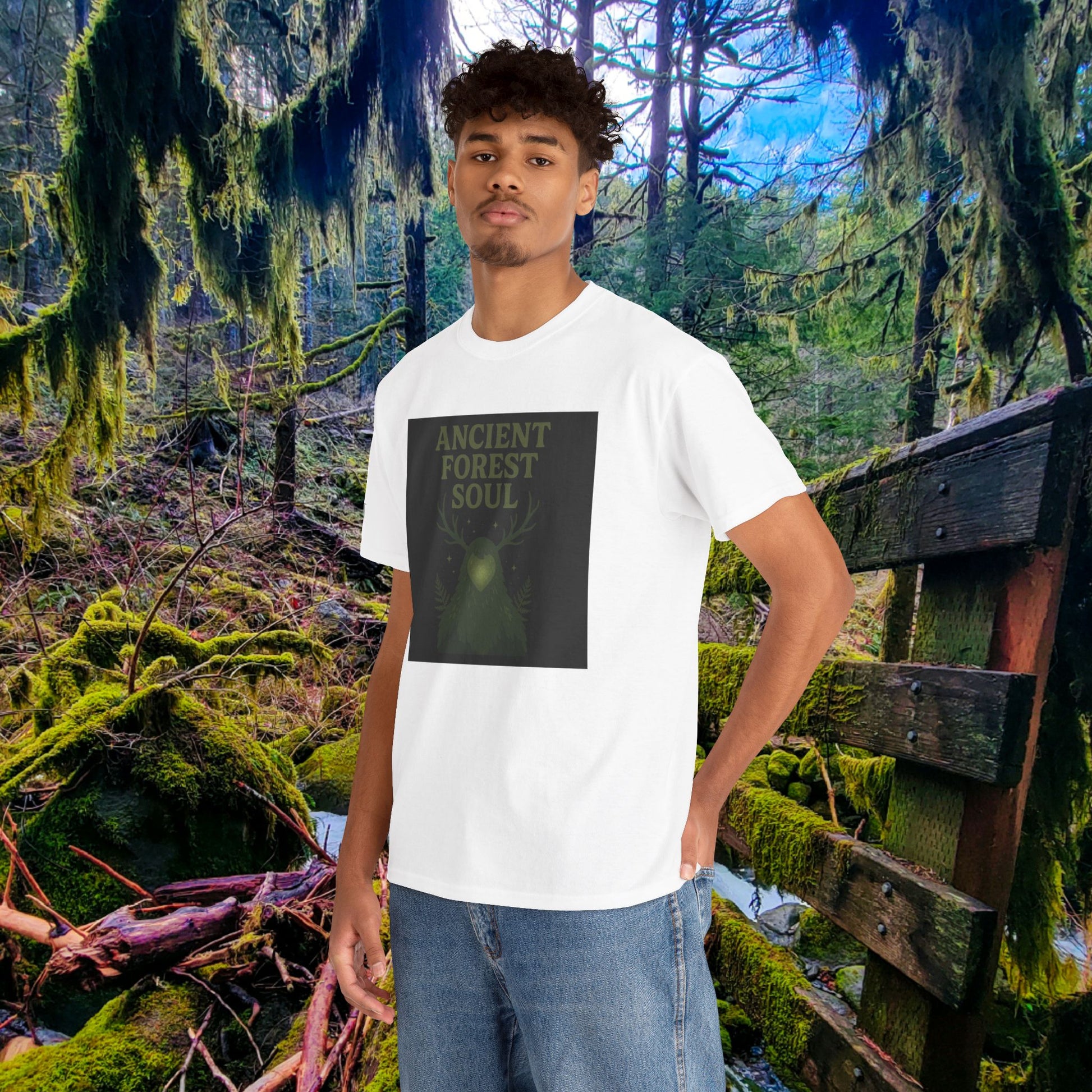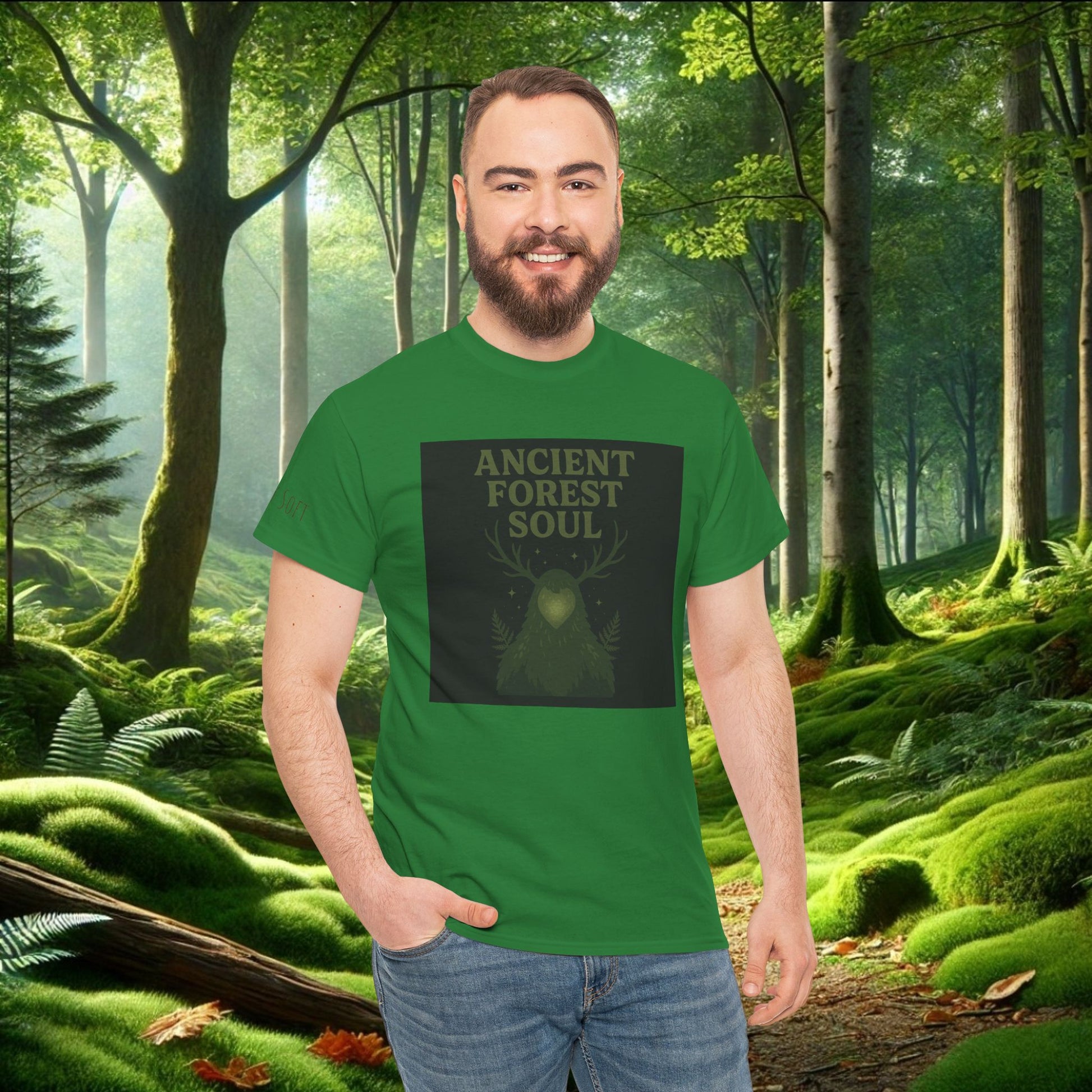 The Ancient Forest Soul tee carries the spirit of the woods — a mossy guardian with antlers, ferns & quiet power. Designed for those who feel most themselves under the canopy, this tee invites you to move through life with grounded magic & forest softness. The sleeve says it best: stay soft.