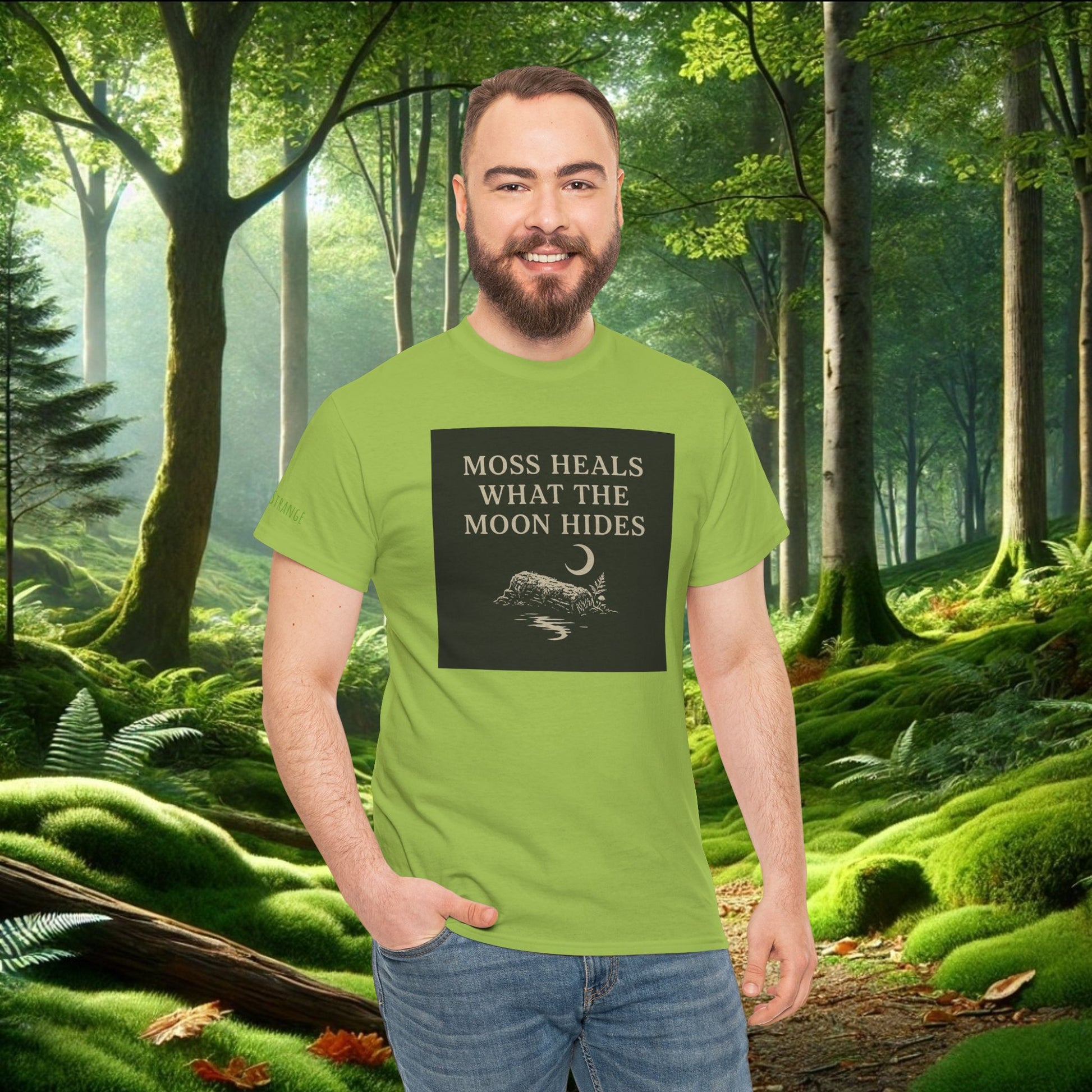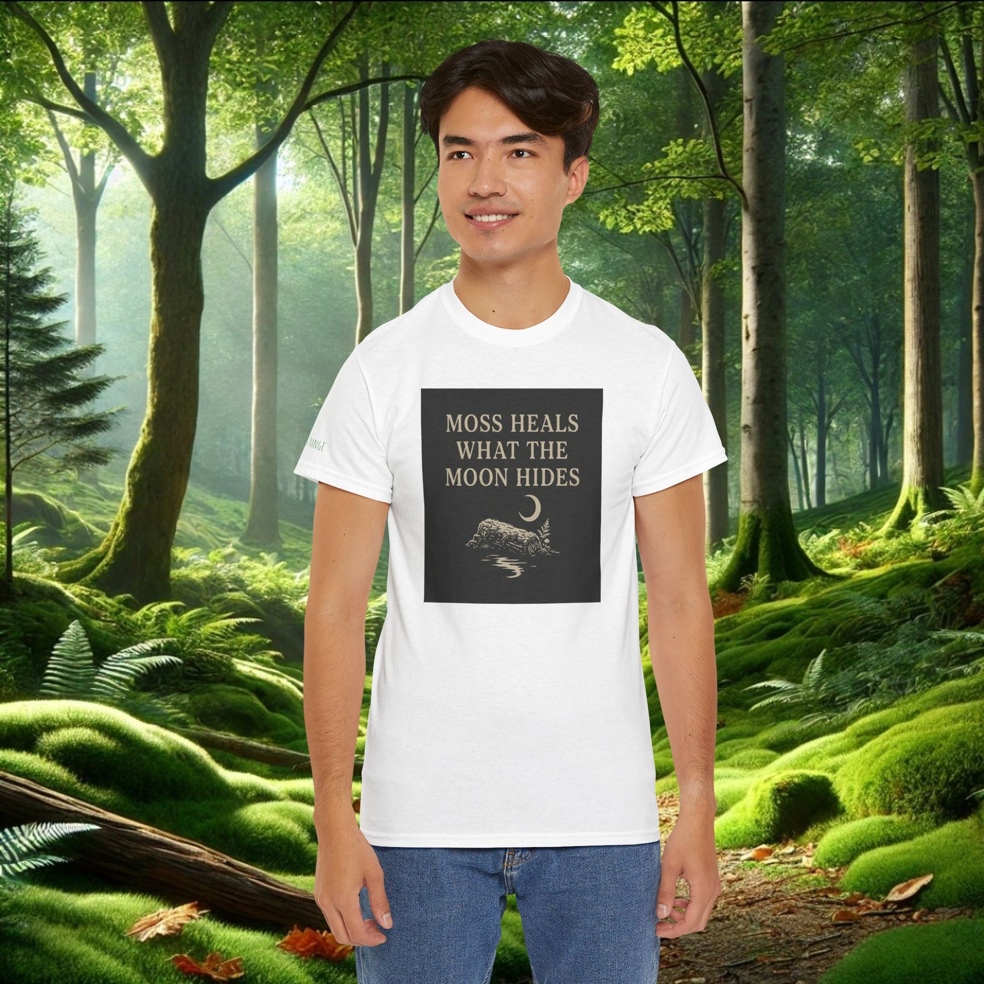 The Moss Heals What the Moon Hides tee is made for souls who move gently through the world — the ones who find comfort in shadows, softness in stillness & a strange kind of magic in moss-covered places. Featuring a subtle front chest print & a bold back design of moss, moonlight & quiet mystery, this shirt is a wearable reminder that nature holds us in ways we cannot always name. On the left sleeve, a whispered message: Stay Strange.