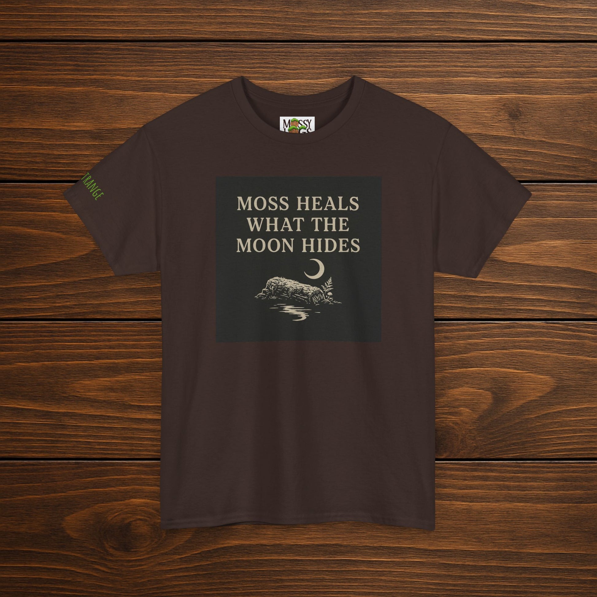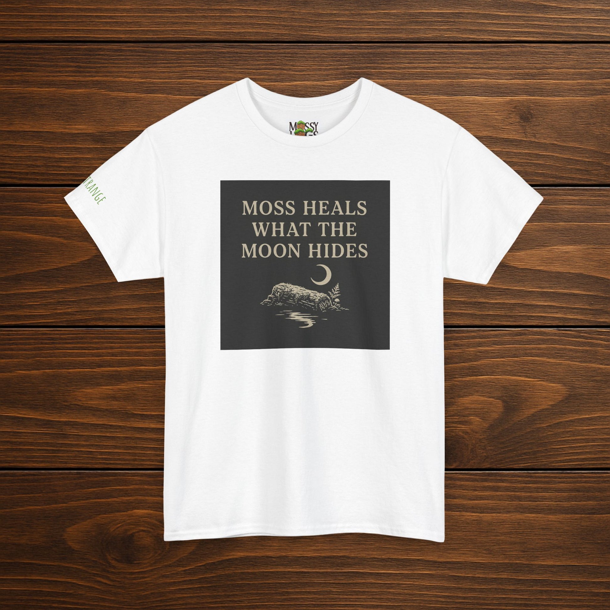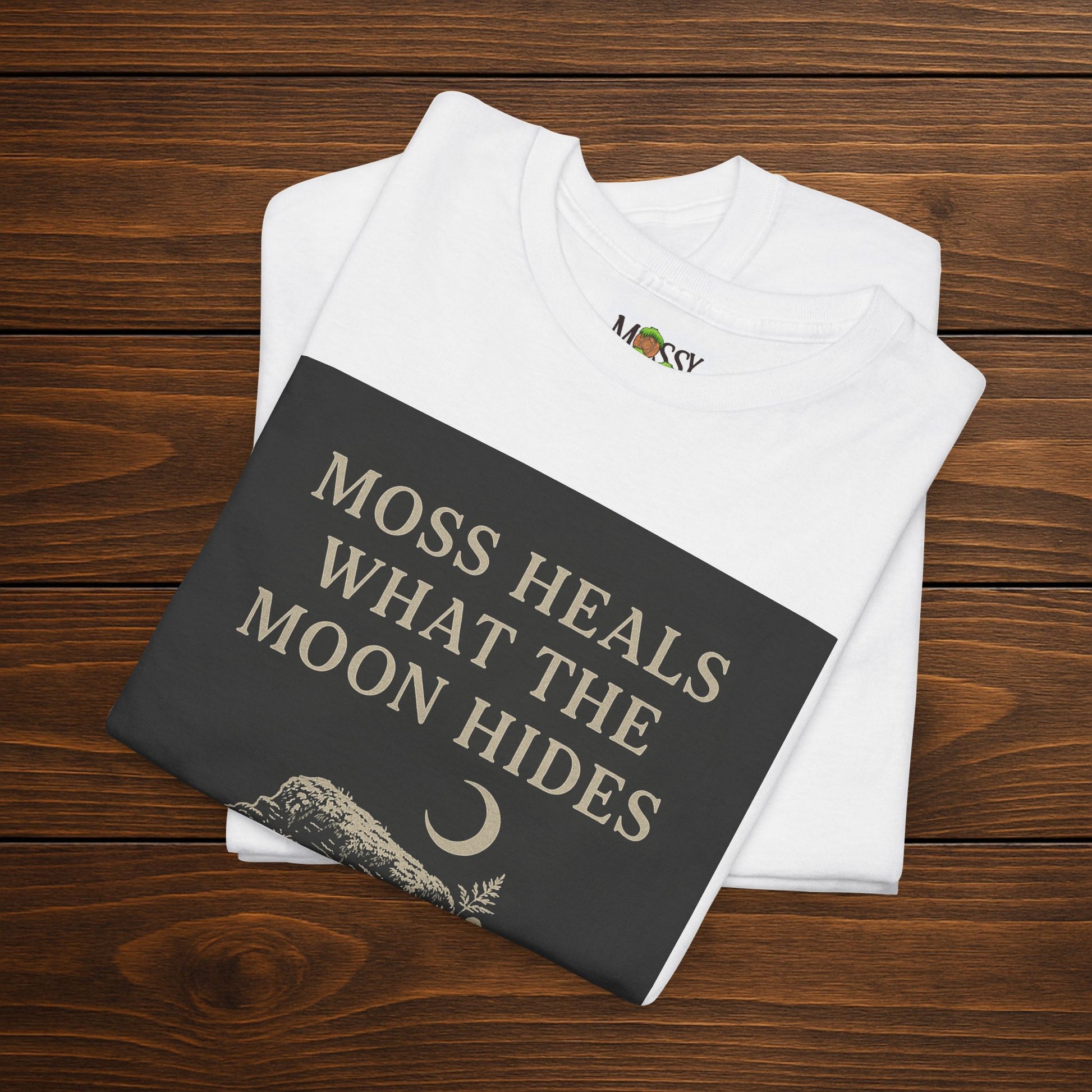 Front: “moss heals what the moon hides” printed on left chest